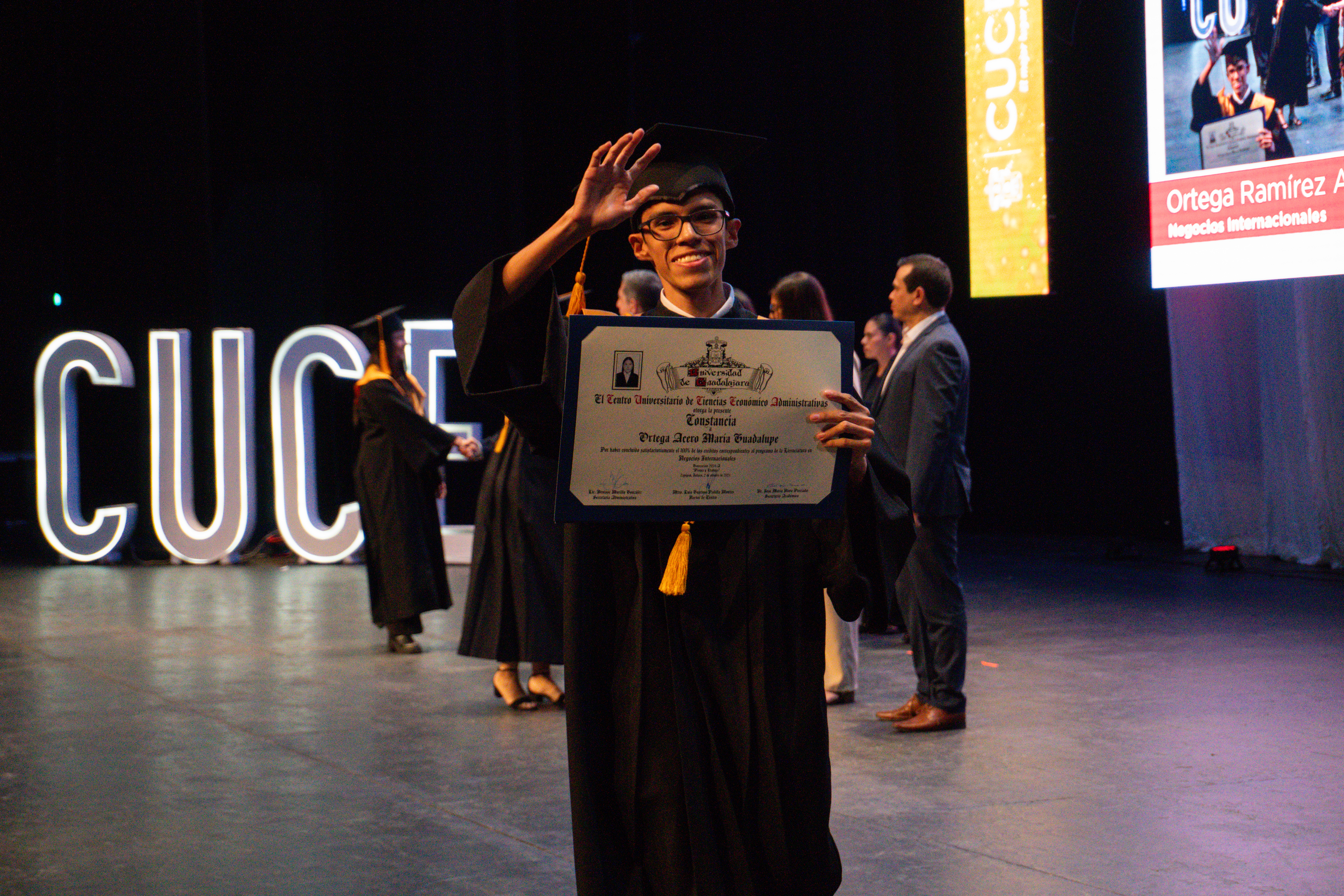 El Mtro. Luis Gustavo Padilla Montes, Rector de CUCEA, las y los coordinadores de las Licenciaturas de Negocios Internacionales, Gestión de Negocios Gastronómicos, Administración Financiera y Sistemas, Mercadotecnia, Relaciones Públicas y Comunicación, Tecnologías de la Información, Recursos Humanos, Gestión de Negocios Gastronómicos, Turismo, Contaduría Pública, Economía, Gestión y Economía Ambiental, Administración Gubernamental y Políticas Públicas, estuvieron presentes para reconocer la trayectoria de las y los graduados.